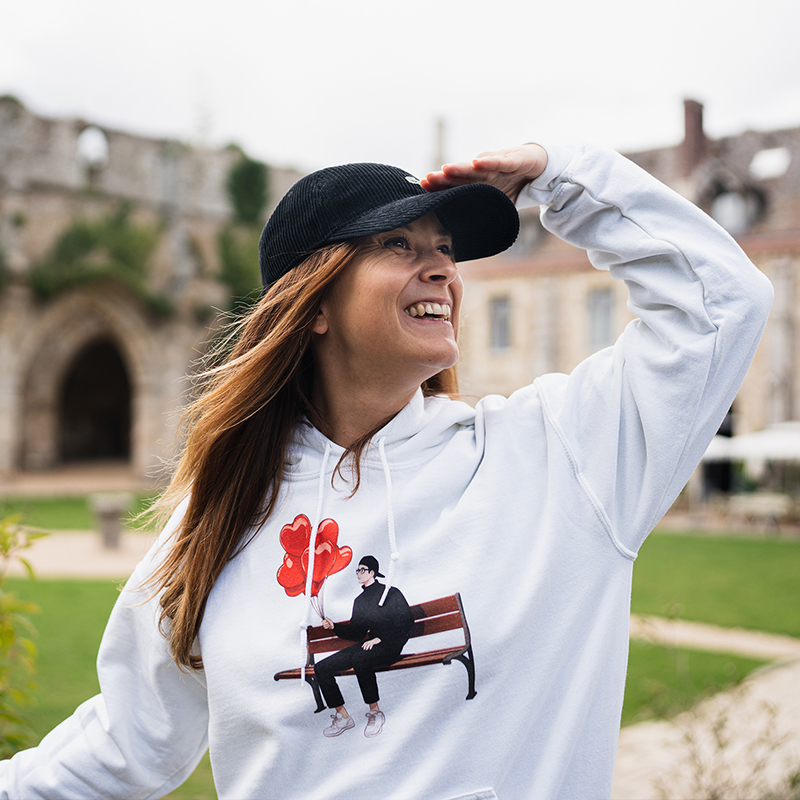 Marie 1,65m, portant habituellement du S (36), porte actuellement un L’amoureux en taille M pour une coupe oversize.